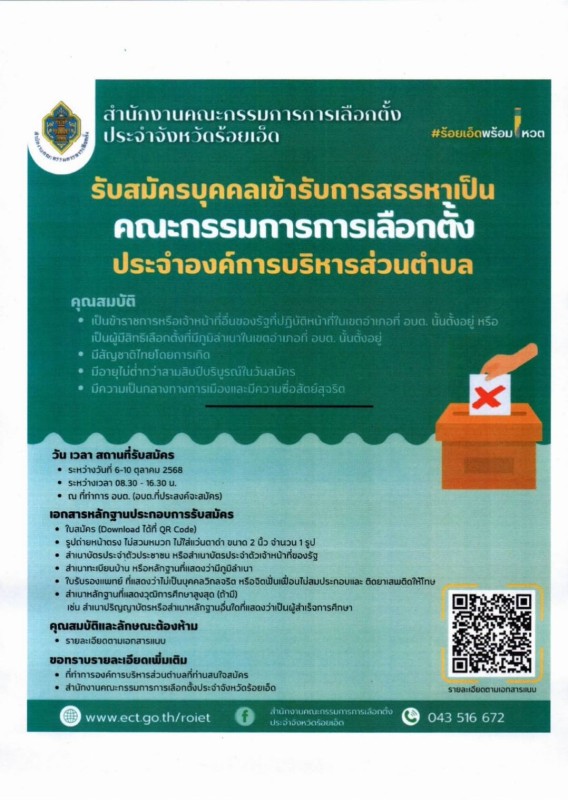 หัวข้อ :: ประชาสัมพันธ์การรับสมัครบุคคลเข้ารับการสรรหาเป็นคณะกรรมการการเลือกตั้งประจำองค์การบริหารส่วนตำบล ให้นายอำเภอทุกแห่งเรียบร้อยแล้ว